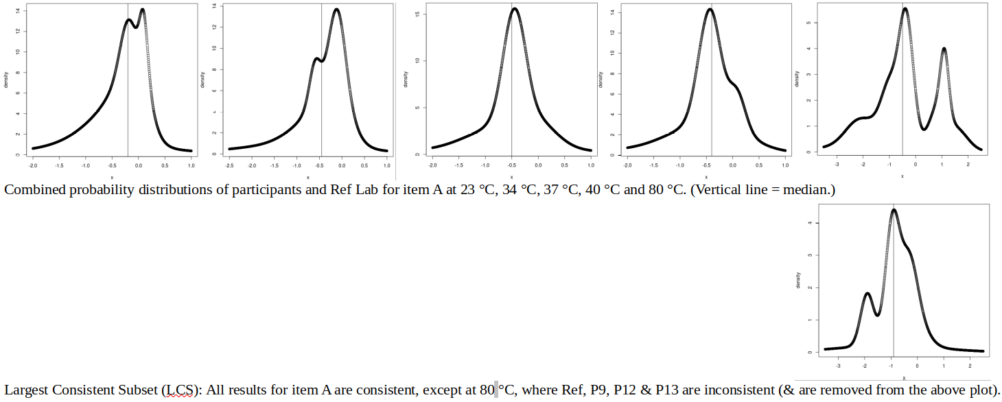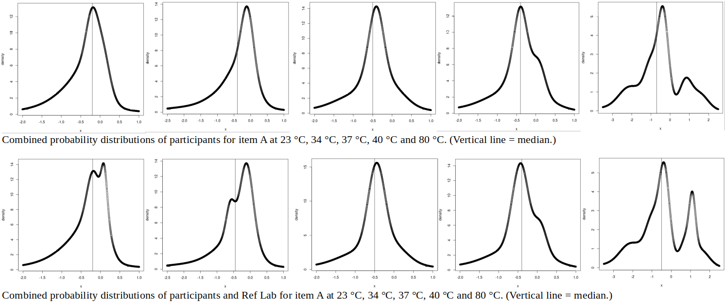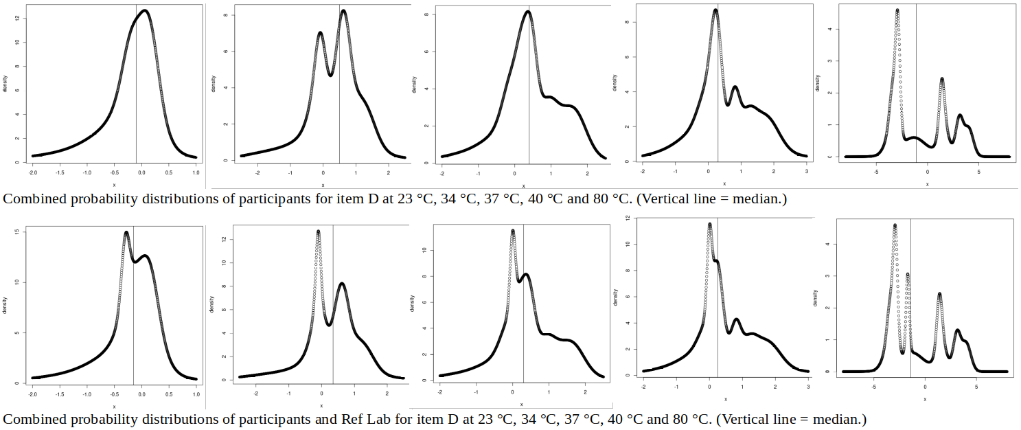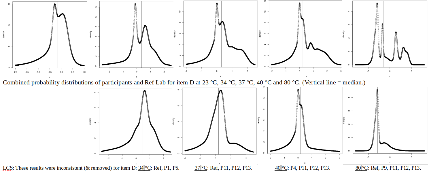 For item A, using the participants’ uncertainties (second row of graphs above) tends to “smear out” the secondary modes (lower peaks) observed in the kernel density plots, suggesting that results in these areas have larger estimated uncertainties. (The effect is similar to enlarging the bandwidth of the kernel density plot.) Including the Ref Lab results in the combined distributions (third row of graphs) adds or heightens a peak in the 23, 34 and 80 °C data. As Ref Lab has the smallest uncertainties, it produces sharp, high peaks. (This is similar to how the weighted mean is dominated by the results with the smallest uncertainties.)