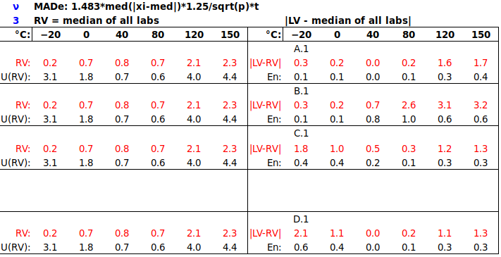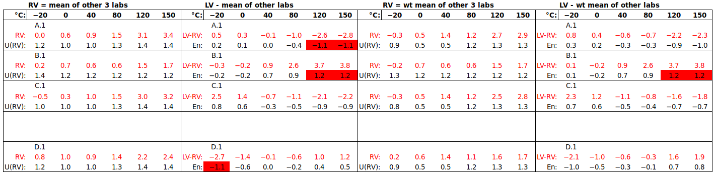 As seen below, either value of U(RV) is smaller than U(LV), for all but participant B.1 at lower temperatures, so tests the capabilities of laboratories A, C and D fairly rigorously. It does not, however, meet the criterion for uncertainty of the assigned value u(x_pt), relative to the “performance evaluation criterion” σ_pt, suggested in ISO 13528 clause 9.2.1, namely