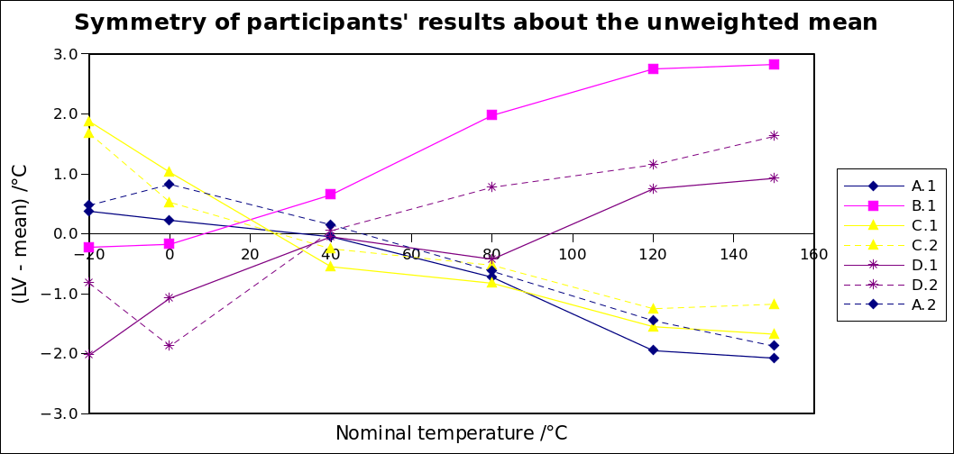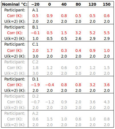 In this example, one infrared thermometer was calibrated from -20 to 150 °C. The pilot laboratory invited the other three laboratories to participate based on their reputation for competence in the field, so that all four laboratories might contribute to RV. Viewing conditions were specified (100 mm from a 50 mm diameter target, or 300 mm from a 150 mm target, etc), so that differing Size-of-Source Effect would not render the results incomparable. Three laboratories submitted multiple result sets (measured by different metrologists), but selected one set to contribute to RV, as required by the protocol. The results are presented below, in the sequence in which they were measured, with secondary results from relevant laboratories being identified as “x.2″: