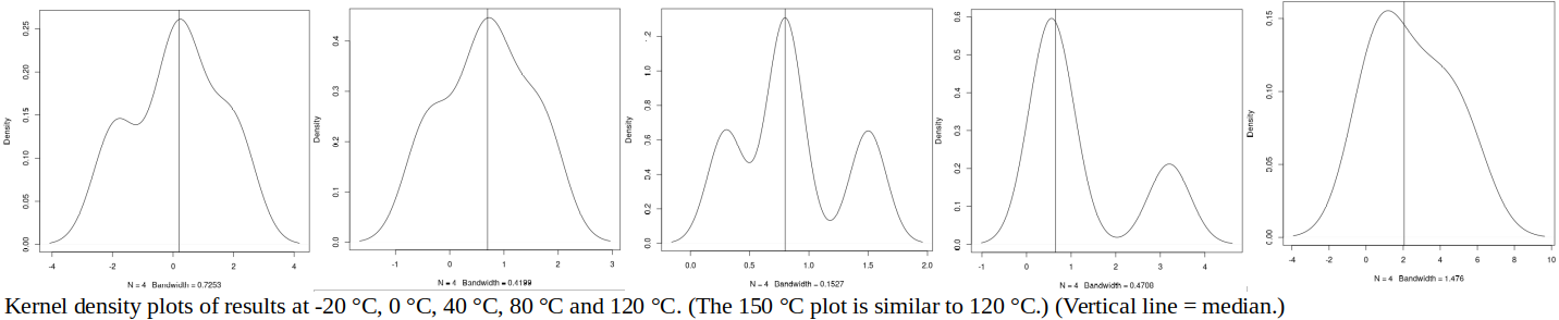 It is observed that these kernel density plots allow for better visual review of the data than does the graph of results relative to the mean. (There is significant asymmetry in the 80 °C and 120 °C results, which was not obvious in the graph relative to the mean.)