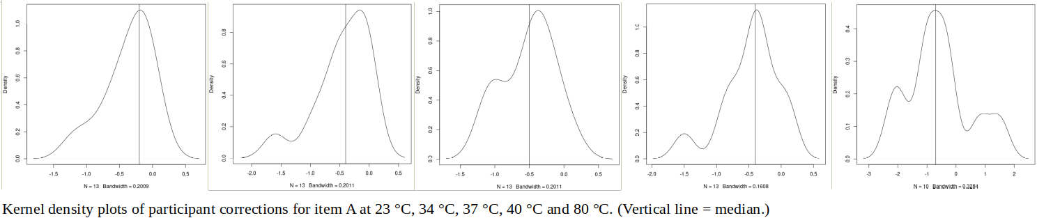 ∙The kernel density plots indicate that results at most temperatures are multi-modal and not symmetric, which may cause problems in data analysis, as mentioned in 13528 clause 5.3 (“Most common analysis techniques for proficiency testing assume that a set of results … will be approximately normally distributed, or at least unimodal and reasonably symmetric”). Even robust analysis techniques [13528 Annex C] assume symmetric distribution of data.