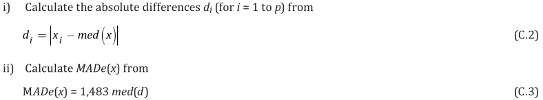 However, an estimator that is more robust against outliers is the median [13528 clause C.2.1], which is the middle value when participant results Latex formula are sorted in increasing order. Its standard deviation may be estimated by the scaled median absolute deviation (MADe), which is calculated as follows [13528 clause C.2.2]: