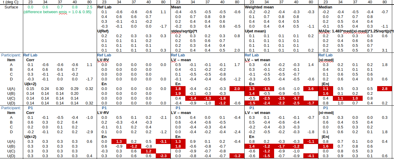 The tables below show corrections for four infrared thermometers (A to D) at five temperatures (from 23 to 80 °C), reported by a superior reference laboratory (Ref Lab) and by 13 ILC participants (P1 to P13). As recommended in 13528 clause 6.4, graphs are presented for visual review of data. (In this case, kernel density plots [13528 clause 10.3] are prepared for items A and D.) Participant results are compared to various assigned values (Ref Lab, mean, weighted mean and median), and participant performance evaluated using En scores [13528 clause 9.7]. The results and choices of RV are discussed below.