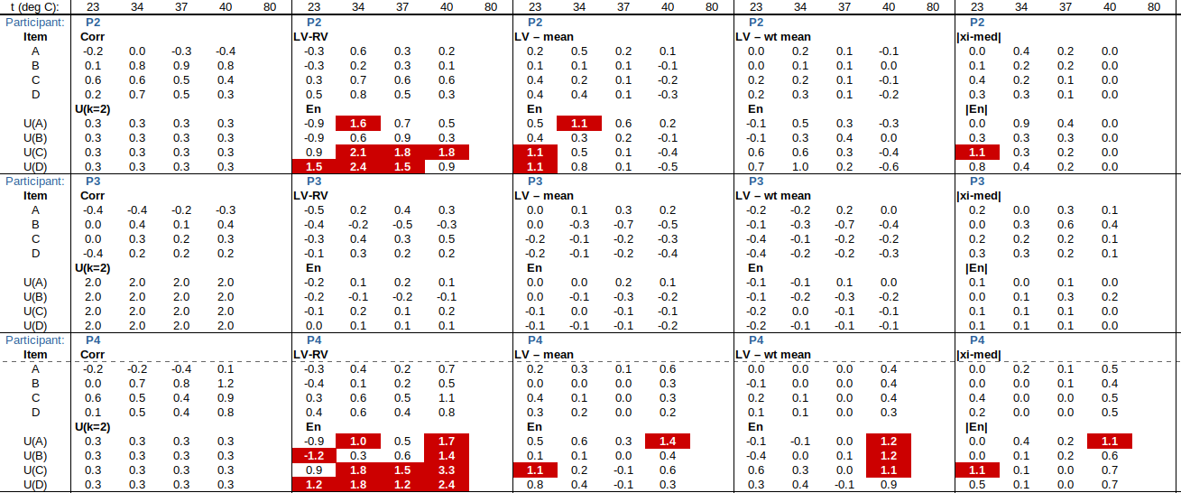 ∙The spread of participant results, as represented by U(mean) or U(median), is larger than the uncertainties estimated by participants, represented by U(weighted mean), at all temperatures, but the difference is particularly large at 80 °C. This indicates that participants either neglected significant uncertainty components, or that the items drifted significantly during circulation, or both.
