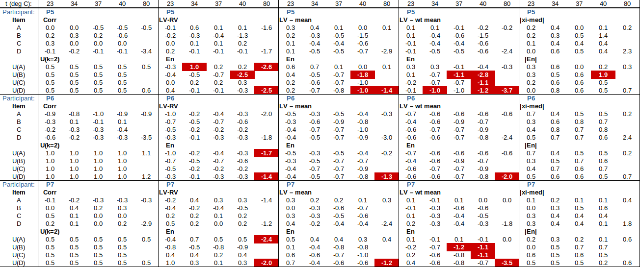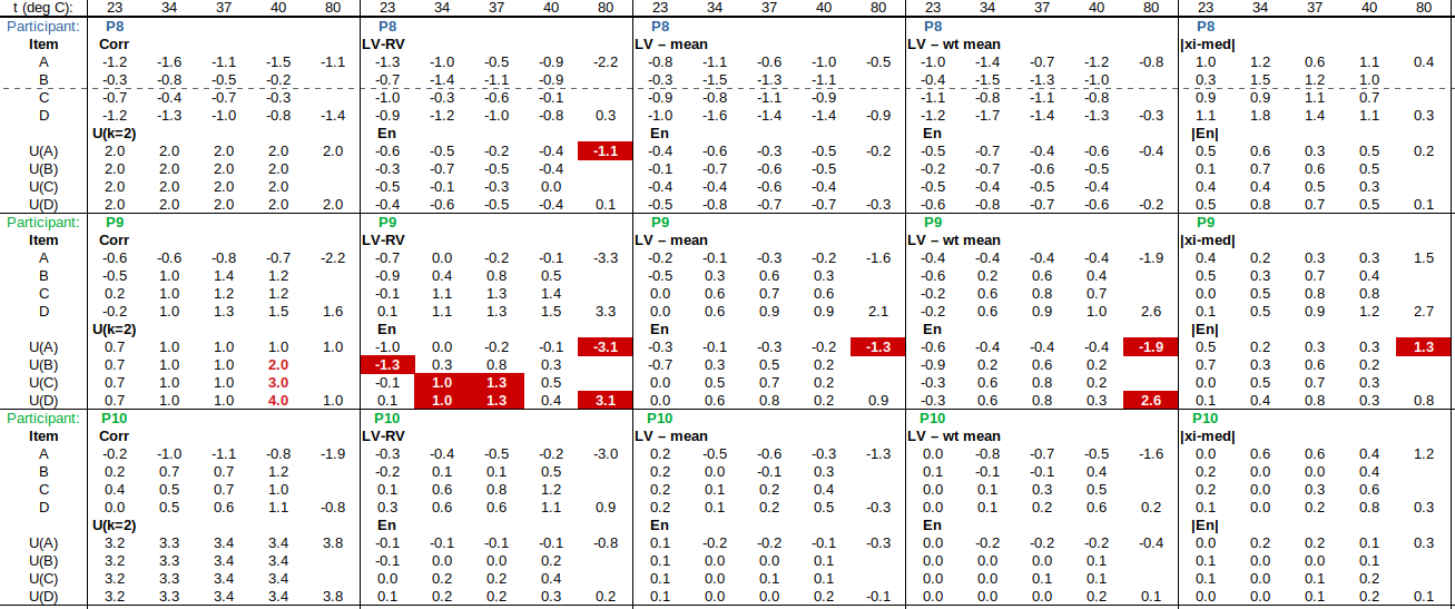 ∙Some results of Ref Lab, particularly that for item A at 80 °C, are suspect when compared to the median of participant results. As mentioned above, even a reliable reference laboratory should be used with care.