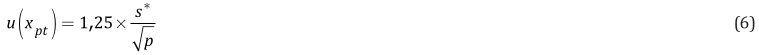 This “robust standard deviation” s* is converted to standard uncertainty of the assigned value, Latex formula, as follows [13528 clause 7.7.3]: