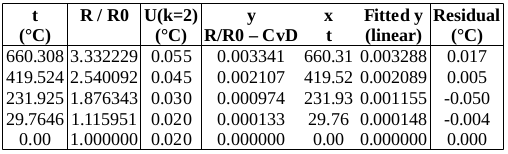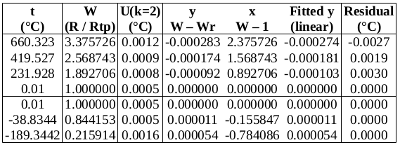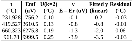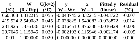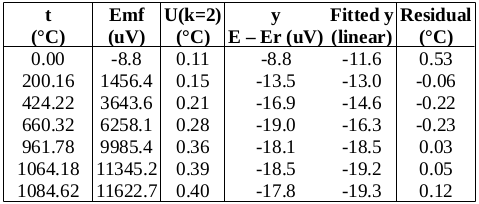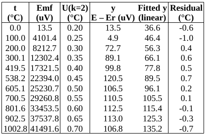 For “electrical” sensors such as resistance thermometers (RTDs) and thermocouples, the “quality” of the reference function (or reference tables) is often the important factor: If it represents any complex structure in the resistance or voltage vs temperature relationship well, then the deviation of a sensor from the reference function will be smooth and simple, requiring few calibration points, even over wide temperature ranges. For example, the 1993 NIST reference function for type R (Pt-Rh/Pt) thermocouples [Burns et al, NIST Monograph 175], reproduced in IEC 60584-1 of 1995 and 2013, is good enough to allow accuracies of (0.1 to 0.2) °C between calibration points several hundred degrees Celsius apart.