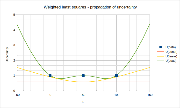 In this idealised example, there is no correlation between the three calibration points, all of which have an uncertainty of 1 at the calibration points 0, 50 and 100 (arbitrary units). Extrapolating 10% beyond the calibration range (to -10 or 110), the uncertainty of the quadratic curve increases to 1.4, so, in ideal conditions, it may be justifiable to extrapolate 10% beyond the calibration range and estimate the uncertainty there as 1.5 times the uncertainty within the range. (This very simplified analysis predicts an increase in uncertainty of 12.5% when extrapolating by 4% of range, which is comparable to the 20% increase reported by Nakano [Nakano & Tamura, “Extrapolation of the ITS-90 down to the boiling point of nitrogen from the triple point of argon”, J Phys Conf Series, 2018] when extrapolating to -196 °C from a -189 to 0 °C SPRT calibration.)